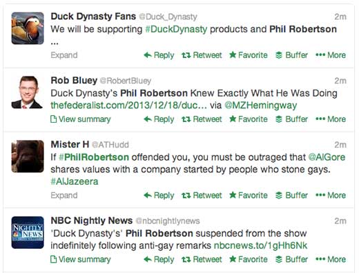 His name is listed as one of the Top Trending names on Twitter. People are changing their avatars on Facebook to Phil Robertson’s picture in support of Phil. From local television to national media outlets…they are cashing in on this topical issue with tweets and Facebook statuses inciting discussions to leverage Likes, follows, traffic, and social conversation.