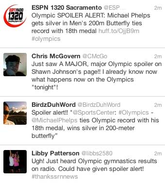 All week, people have been bitching and complaining about the Olympic spoilers. Think back to Tuesday when the Women’s Gymnasitics won Gold, first time since 1996. Huffington Post and many other outlets posted pictures and information immediately to the front pages of their websites, then tweeted and shared with the world.
